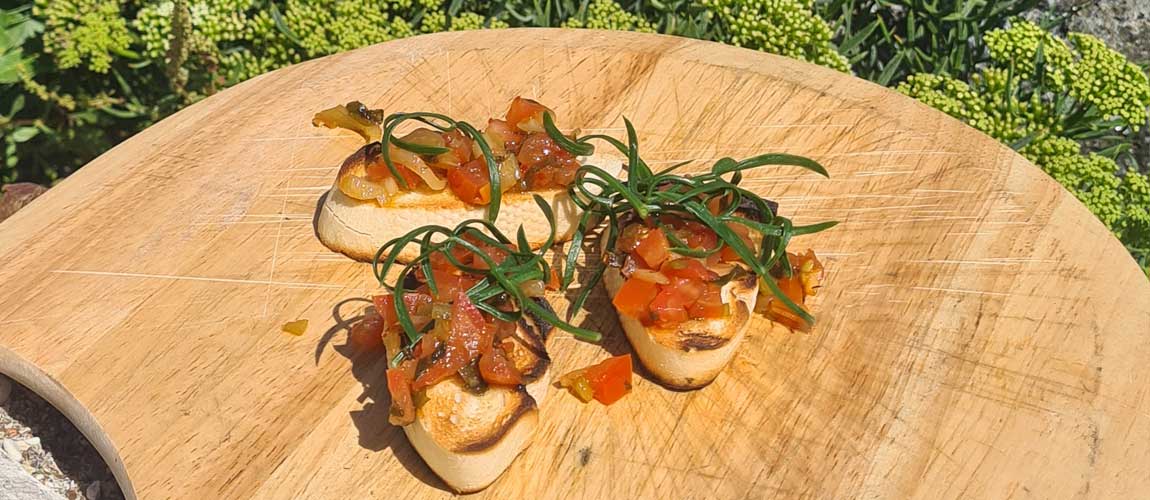 Take the ready made bruschetta mix, sliced bread and fire lighting materials with you and gather some coastal sea plants to be blanched. Use the initial flame of the fire to blanche the vegetables for 30 seconds and then use the embers of your fire wood to toast the thinly sliced french stick.